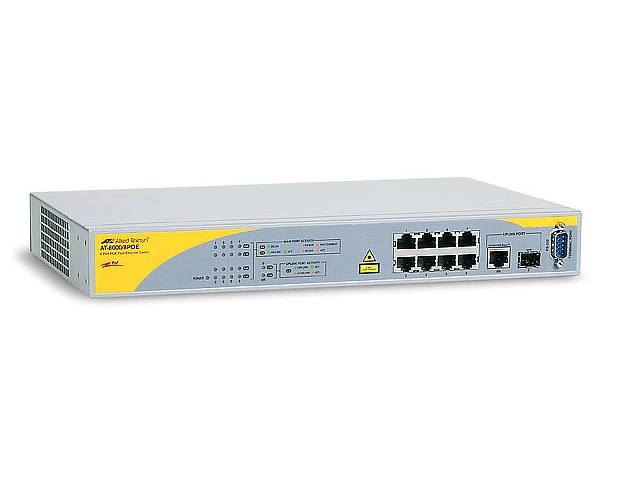 Граничные коммутаторы Allied Telesis AT-8000/8POE Fast Ethernet серии 8000 для оптоволокна для использования в сетях малого и среднего размера, с 8 портами 10/100 Мб/с, 1 портом 10/100/1000Т и совмещенным портом SFP позволяющим подключаться к магистральной сети или серверу с использованием оптического волокна.