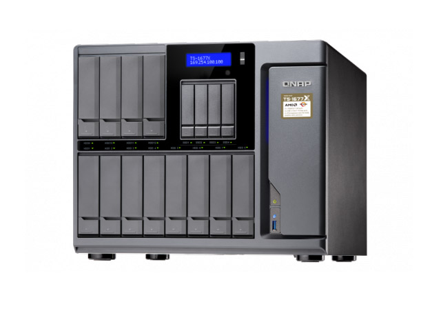 Сетевой RAID-накопитель QNAP TS-1677X, 12 отсеков 3,5 или 2,5 дюйма, 4 отсека 2,5 дюйма (суммарно 16 слотов), 2 порта 10 GbE BASE-T, HDMI-порт. Процессор AMD Ryzen7 от 8 ядер, оперативная память DDR4 до 64 Гб. ОС QTS.