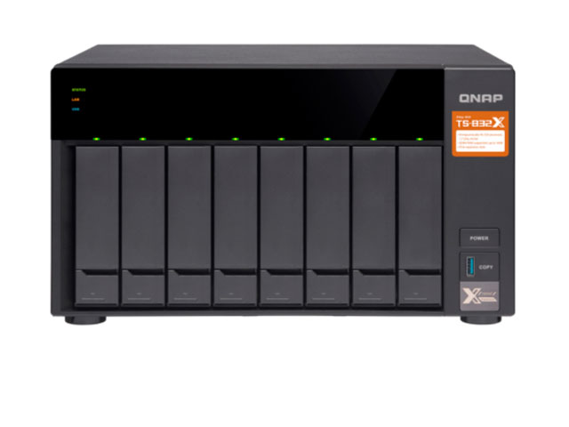 Сетевой накопитель QNAP TS-832X, 8 отсеков 3,5 / 2,5 дюйма, 2 порта 10 GbE SFP+, настольный форм-фактор. Процессор Cortex-A57 Annapurna Labs Alpine от 4 ядер с частотой от 1,7 ГГц, оперативная память DDR4 от 2 Гб с возможностью расширения до 16 Гб. Операционная система QTS.
